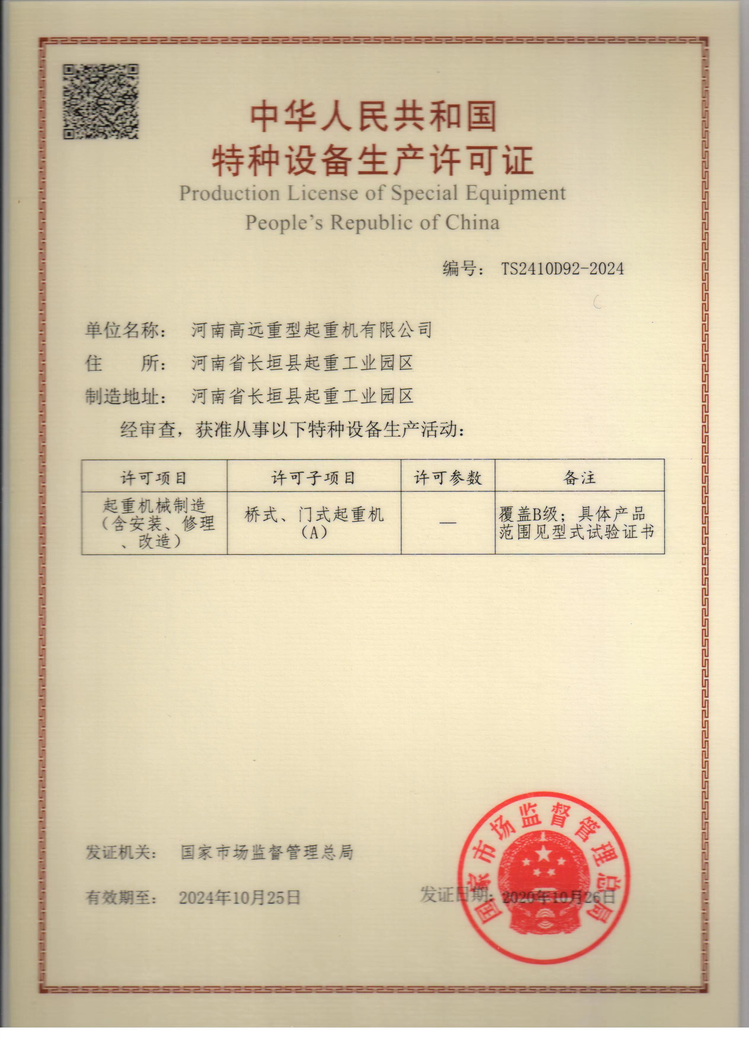 特種設(shè)備生產(chǎn)許可證